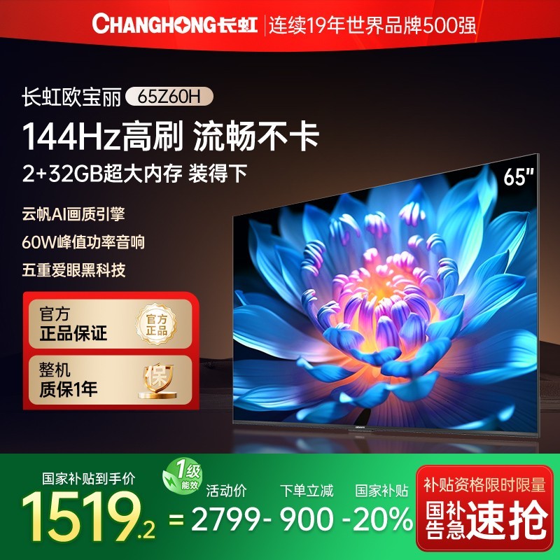 长虹 D8K系列 65英寸液晶电视,型号65Z60H,现参加官方标配天猫商城促销活动,售价直降336元,当前到手价仅需1899元,原价2299元,本次降幅达61%,与上次爆料价持平,性价比出众。该电视搭载76804320超清分辨率和10bit面板,支持8K解码与120Hz运动补偿,采用ADS广视角硬屏和点阵光控技术,画质细腻色彩自然。内置12nm Mediatek芯片,配备5GB运行内存和32GB存储空间,支持4K转8K画质提升。音效方面支持杜比视界、HDR10、杜比全景声及DTS调音技术,带来沉浸式视听享受。接口齐全,配有HDMI 2.1、USB3.0,支持5G Wi-Fi和蓝牙5.0连接,遥控器支持AI语音控制,智能便捷。外观采用超薄金属机身与拉丝工艺,屏占比高达98%,兼具性能与颜值,是家庭娱乐的理想之选。
