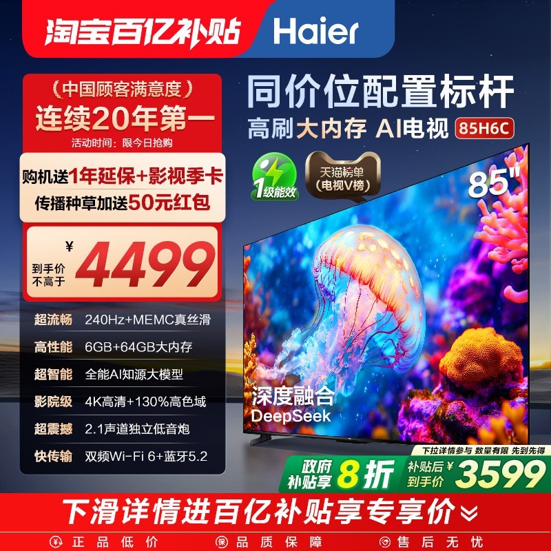 海尔 Haier H6 Pro系列 85H6 Pro 液晶电视 85英寸 4K 大屏震撼上市,现正火热促销中。这款电视拥有85英寸超大屏幕,带来影院级视觉体验,支持全通道240Hz高刷新率,无论是观影还是连接游戏主机都能清晰流畅不拖影,内置MEMC动态补偿技术,高速画面更稳定,搭载VRR、ALLM等HDMI2.1特性,游戏体验更上一层楼。电视覆盖130% BT.709高色域,ΔE≈1,色彩表现精准细腻,配备四核处理器与6GB+64GB大存储,运行流畅多任务不卡顿,双频WIFI6加快网络加载速度,2.1声道50W大音响结合杜比解码,打造沉浸式音效体验。目前该商品参加满7499减2400元活动,叠加国家补贴再减1019.8元,最终仅需4079.2元即可到手,喜欢的朋友不要错过这次超值机会。