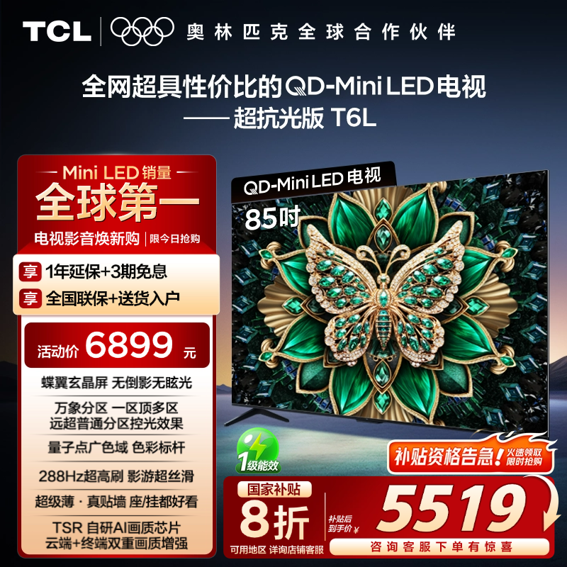 本文属于原创文章,如若转载,请注明来源:TCL 85T6L 85英寸液晶电视天猫促销价5519元https://tv.zol.com.cn/1029/10294873.html