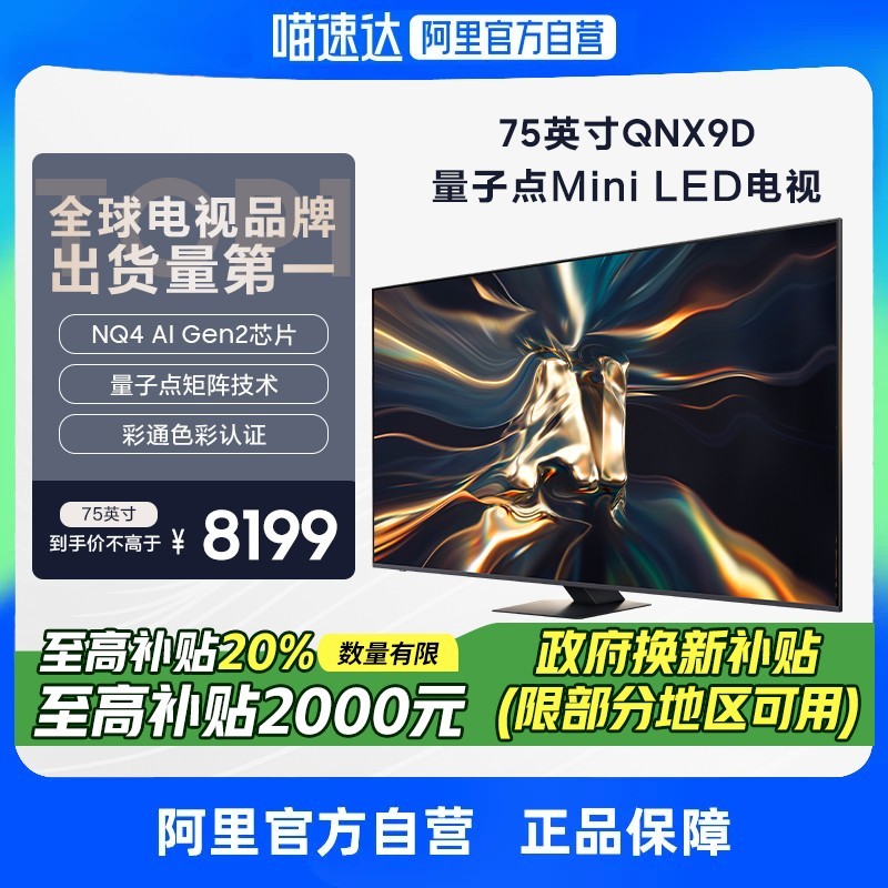 三星SAMSUNG 75QNX9D 75英寸超薄4K MiniLED AI智能电视机正在天猫商城促销。其屏幕尺寸为75英寸,颜色是黑色,套餐类型为官方标配。这款电视机原价10499元,现在使用商品详情页领取的满5000元减1010元优惠券,再加上国家补贴8折起(可减1897.8元)后,最终到手价只需7591.2元/件。