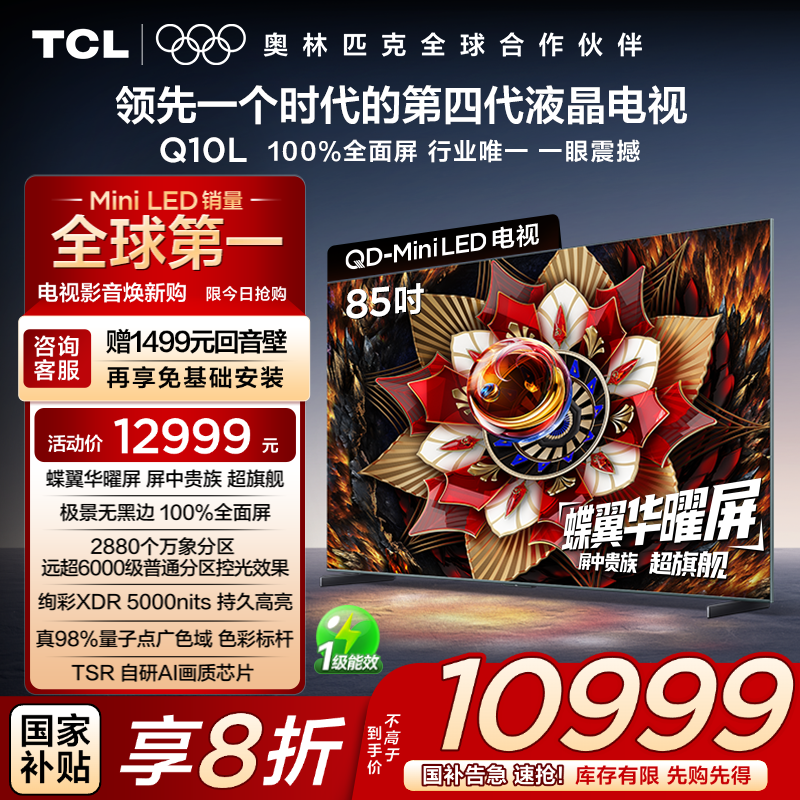 TCL 85Q10L 85英寸极景QD-Mini LED万象分区电视机,拥有超清大屏与高动态分区背光技术,带来影院级视觉享受,色彩更鲜艳,画面更细腻,音画合一沉浸式体验居家影院,现参与换新补贴活动,原价10999元,现活动售价16999元,叠加满减及补贴后实付低至7879元,限时优惠不容错过