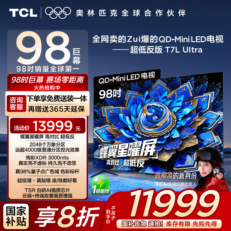 TCL电视98T7L Ultra拥有98英寸的超大屏幕,采用QD - Mini LED蝶翼星曜屏,为用户带来震撼的视觉体验。