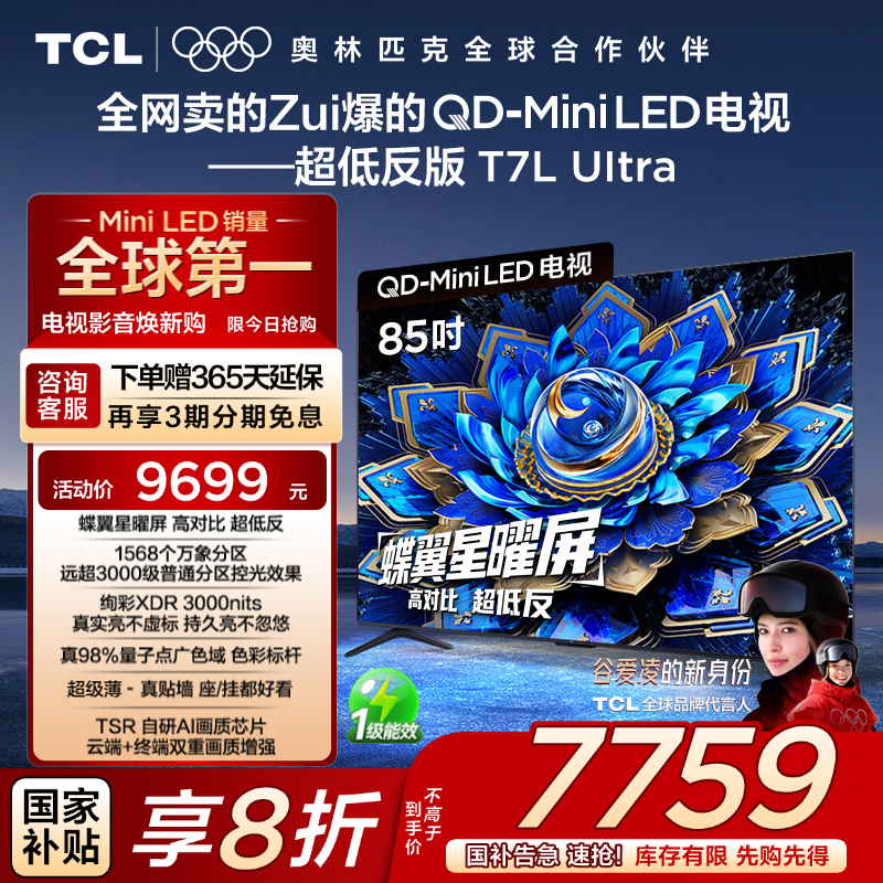 TCL 85T7L Ultra 85英寸电视搭载QD-Mini LED显示技术配合蝶翼星曜屏带来更细腻的画面表现和更广阔的色彩还原能力无论是观影还是游戏都能呈现出震撼的视觉效果其高亮度与高对比度让每一帧都生动逼真新品活动售价12399元现参与多重优惠叠加包括满减立减及补贴后实付低至7759.2元即可将这款高性能大屏电视带回家享受家庭影院级的视听盛宴机会难得错过不再