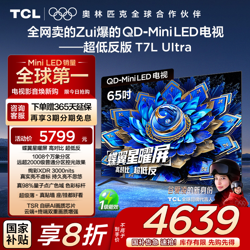 TCL电视65T7L Ultra 65英寸,采用QD - Mini LED蝶翼星曜屏。这款电视新品在天猫TCL集团官方旗舰店上市。