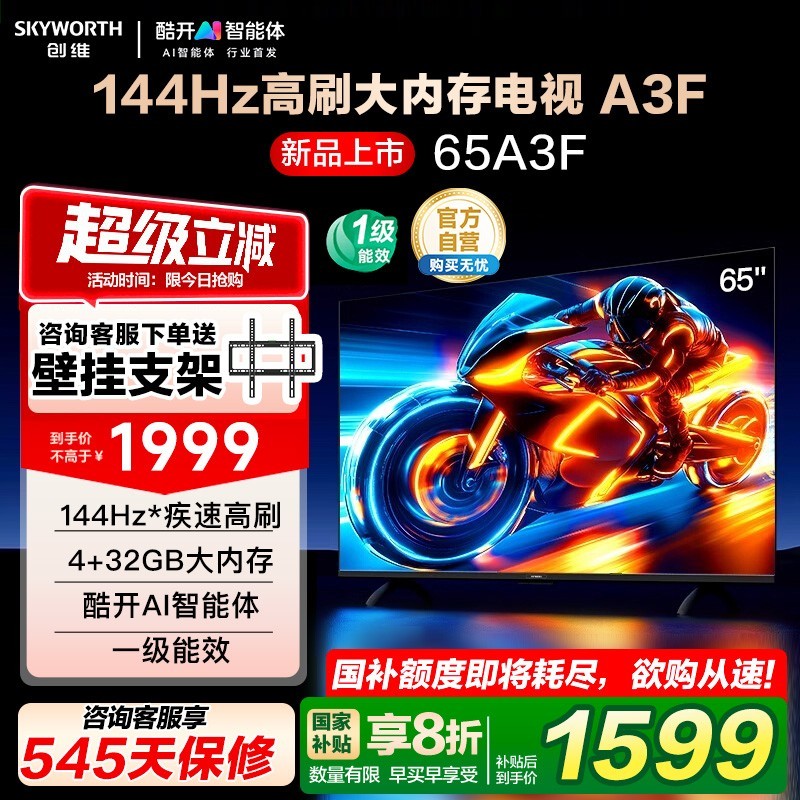 创维电视65A3F 65英寸电视机,采用144Hz高刷新率屏幕,带来流畅无拖影的视觉体验,配备3GB内存+32GB存储空间,支持4K超高清画质,智能系统让观影、游戏更加得心应手,65英寸大屏搭配全面屏设计,沉浸感十足,是家庭娱乐的理想选择。