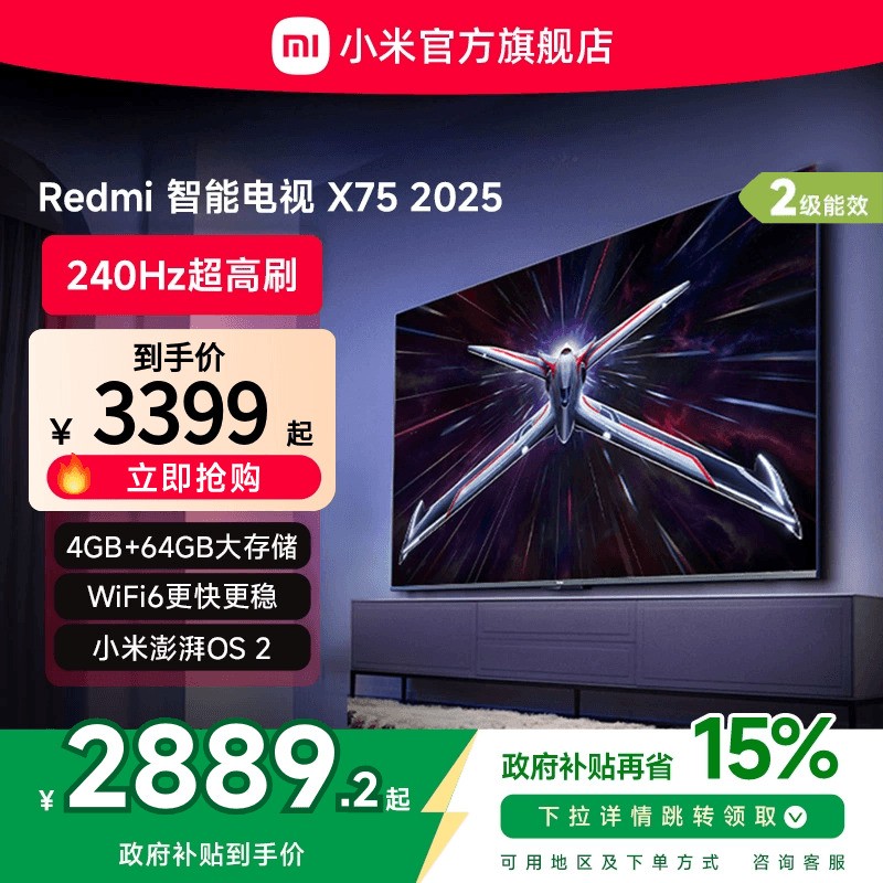 小米Xiaomi MI电视75英寸搭载高性能240Hz高刷屏幕,带来流畅细腻的视觉体验,配备4GB运行内存和64GB存储空间,支持WiFi6网络连接,运行更加稳定顺畅,同时兼容小米澎湃OS系统,实现智能互联更便捷,黑色外观设计沉稳大气,适配多种家居风格,L75RB-RX型号,二级能效节能环保,兼具性能与低耗,此次促销价仅需2889.15元,原价3059.15元,享受国家补贴后立减509.85元,还可叠加满5499减2100活动,喜欢的朋友不容错过。
