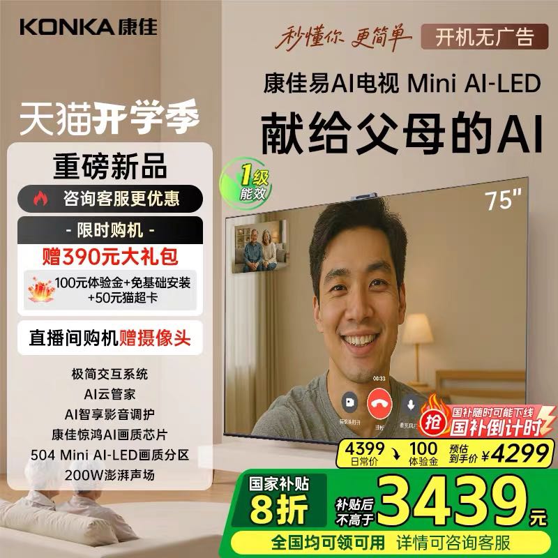 这款电视在天猫康佳官方旗舰店活动售价5799元,下单立减100元新品体验金,还能参与拍立减1400元,同时享受国家补贴20%的优惠活动。如果下单1件,原价4299元,经过一系列优惠后,实付低至3439元,还能享受免基础安装并赠送50元猫超卡。这样的价格就能把这款功能强大的康佳电视带回家,可不要错过这个机会。