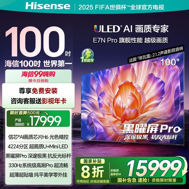 海信 Hisense 电视 E7N Pro 100英寸 U+MiniLED 大屏巨作 世俱杯官方电视机 现在天猫促销火热进行中 原价23999元 现在使用国家补贴直接减2000元 再享8折优惠 最终到手价仅需15999元 海信U+MiniLED技术加持 画质更清晰 细节更真实 大屏观影体验震撼升级 搭载高性能处理器和优质音响系统 智能流畅 声音沉浸 无论是看赛事 追热剧 还是玩游戏 都能带来影院级享受 100英寸巨屏带来更强的视觉冲击力 是家庭娱乐的理想之选 数量有限 喜欢的朋友不要错过此次入手好机会
