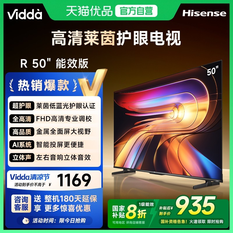Vidda海信50英寸R50液晶平板电视,颜色为经典的黑色,采用一级能效,节能又环保。具备莱茵低蓝光护眼功能,能有效减少蓝光对眼睛的伤害,无论是长时间追剧还是玩游戏都能呵护您的双眼。这款电视非常适合游戏玩家,畅享游戏乐趣。在天猫商城,该商品参加满2599减1430元活...