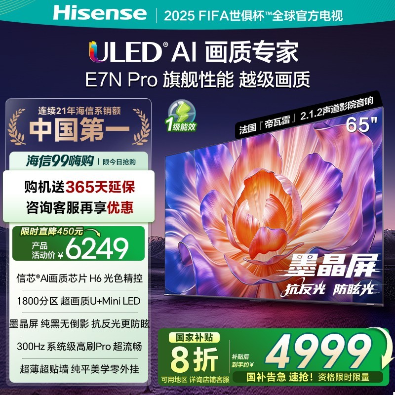 海信Hisense E7N - PRO系列65英寸液晶电视正在天猫商城促销。这款电视拥有出色的性能和清晰的画面,能为用户带来绝佳的视听体验。