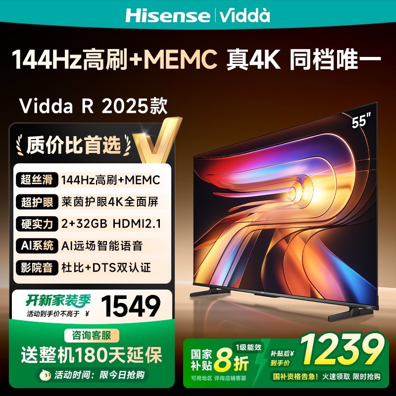 Vidda R55 55V1KD - R护眼液晶电视,拥有55英寸大屏,支持4K显示。在天猫精选平台,这款电视目前活动售价3599元,还可享受限时补贴200元、百亿补贴1850元,并且能参与政府补贴20%的优惠活动。下单1件,原本3599元的电视,实付低至1239.2元,以实惠的价格就能把高品质的4...
