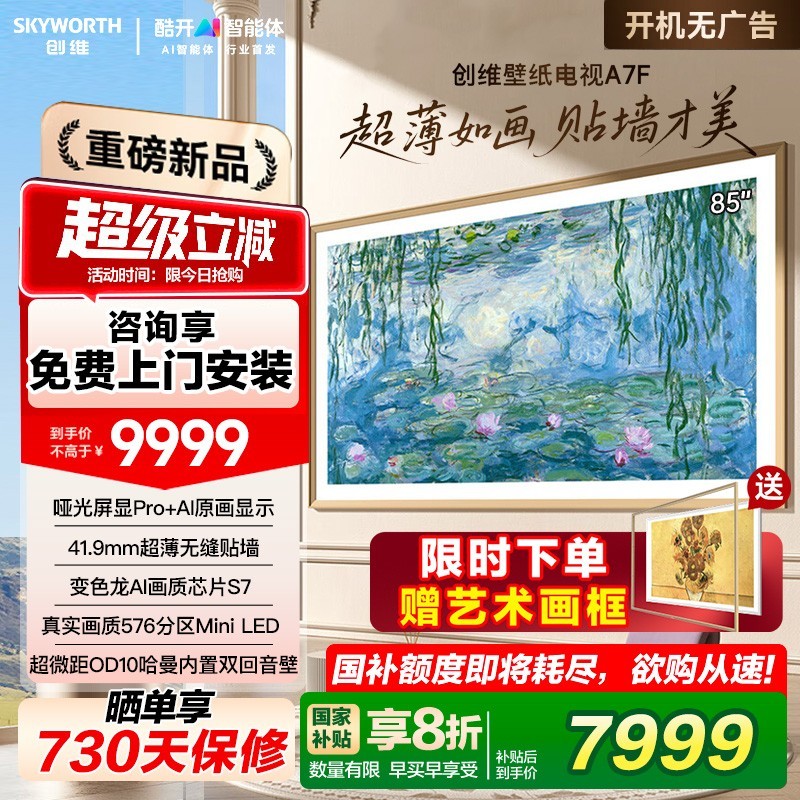 创维壁纸A7F 85英寸Mini LED超薄壁画艺术电视机,屏幕尺寸为85英寸,颜色是经典的黑色,套餐为官方标配。这款电视机采用了Mini LED技术,拥有超薄的外观设计,如同壁画一般,能为家居增添艺术氛围。现在天猫商城正在进行促销活动,可使用商品详情页领取的满200元减200元优惠券,还能享受国家补贴8折起(减1959.8元),另外还有换新补贴20%。
