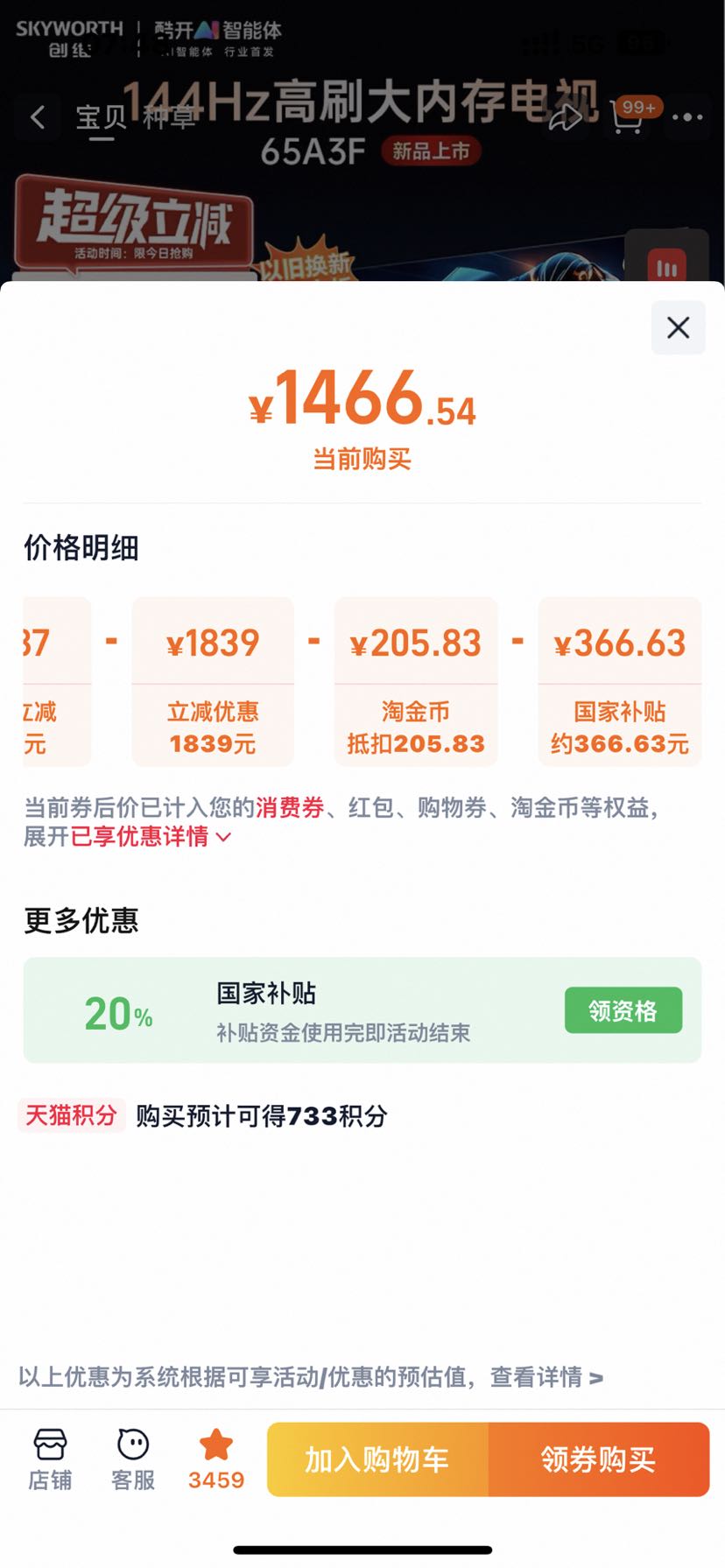 创维65A3F 65英寸电视机全新优惠来袭,原价4575元,现通过多重优惠叠加到手价仅约1400元,性价比爆棚!这款电视搭载4K超高清液晶屏幕,支持144Hz高刷新率,画面流畅顺滑,无论是观影还是畅玩大型游戏都表现出色。配备4GB大运行内存和32GB存储空间,系统运行流畅,三四年不卡顿,智能操作更轻松。作为一款专为现代家庭设计的智能平板电视,它支持多种投屏方式,内置丰富影视资源,满足全家娱乐需求。此次促销参与立减687元、享受20%起减407.8元补贴,还可叠加优惠券、省钱卡红包及淘金币等多重福利,实实在在让利消费者。江苏地区更可叠加国补政策,其他地区用户也可查看详情享受相应优惠,机会难得,买到就是赚到!