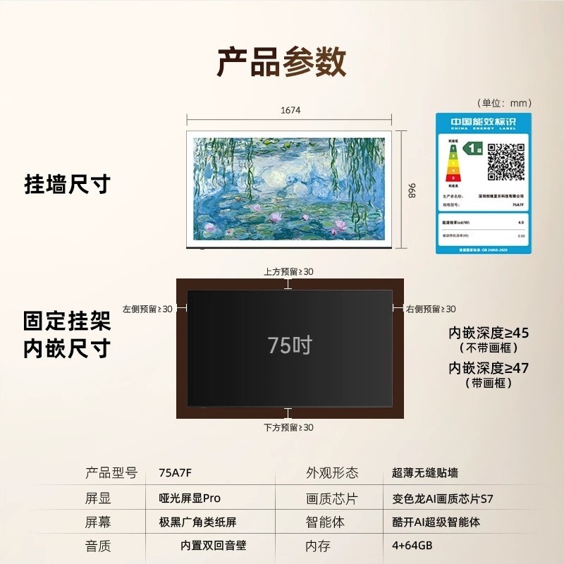 创维75英寸壁纸电视A7F震撼来袭,超薄壁画设计融合艺术美学与现代科技,将极简风格完美融入家居环境,宛如一幅悬挂在墙上的艺术品。采用mini LED显示技术,画质细腻逼真,色彩层次丰富,搭配智能光感调节,无论白天夜晚都能呈现理想视觉效果。75英寸大屏带来沉浸式观影体验,支持智能语音操控和多设备互联,轻松畅享海量影视资源。
