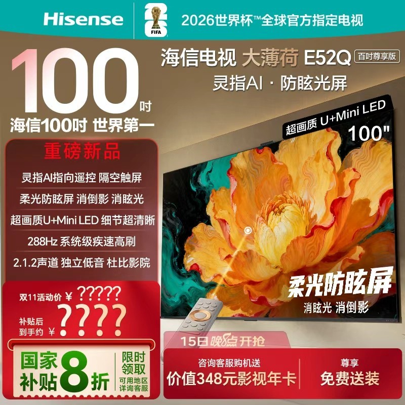 海信 Hisense 电视大薄荷 E52Q 100 吋来袭!这款电视配备 AI 指向遥控,操作便捷,让你轻松掌控电视功能。采用柔光防眩屏,有效减少眩光,带来舒适的观看体验。同时运用 MiniLED 技术,画质表现出色。