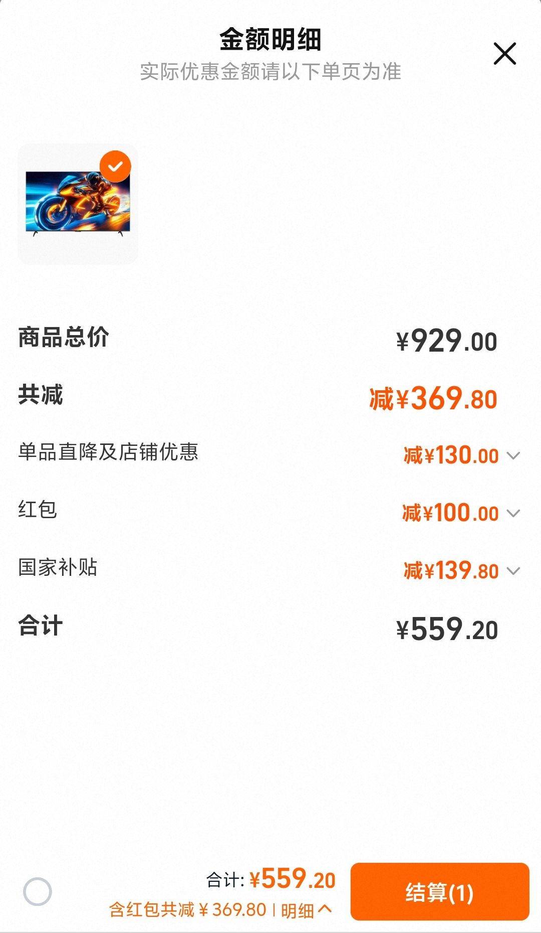 若使用云闪付还能享受500 - 15的优惠,原价929元的电视,最终到手价仅559.2元。如此实惠,赶快入手一台吧!