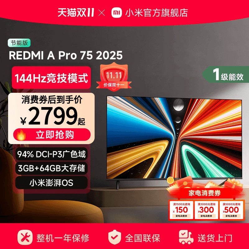 红米A Pro 75 2025节能版L75RB-APE液晶电视75英寸4K超高清巨屏震撼来袭,现天猫精选大促钜惠原价4599元,现活动售价仅4599元,叠加百亿补贴立减1500元,参与补贴享20%起再减559.8元,还可使用满3000减300消费券,多重优惠叠加后单件实付低至2239.2元,性价比爆棚!这款75英寸4K超高清大屏电视采用先进节能技术,画质清晰细腻,色彩还原真实,支持智能语音操控和多种投屏方式,搭载高性能处理器,运行流畅不卡顿,无论是观影、游戏还是家庭娱乐都能带来沉浸式视觉享受,大屏客厅理想之选,节能省电更环保,机会难得,抢到就是赚到,立即下单锁定2239.2元超值到手价。