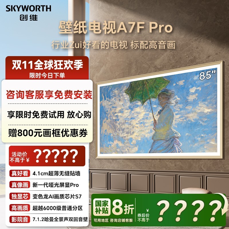 创维壁纸电视A7F Pro 85英寸超薄壁画艺术Mini LED电视机以高端科技与艺术美学完美融合,重新定义家庭视听体验。这款电视采用超薄一体化设计,机身纤薄如画,贴合墙面宛如一件艺术装饰品,真正实现“墙上一幅画”的视觉享受。搭载Mini LED显示技术,具备高亮度、高对比度和精准控光能力,画面细腻通透,色彩真实生动,无论是观看电影、体育赛事还是玩游戏,都能带来身临其境的震撼体验。内置高性能芯片,支持4K超高清解码和MEMC动态补偿,运行流畅不卡顿,搭配大功率音响系统,声画俱佳。