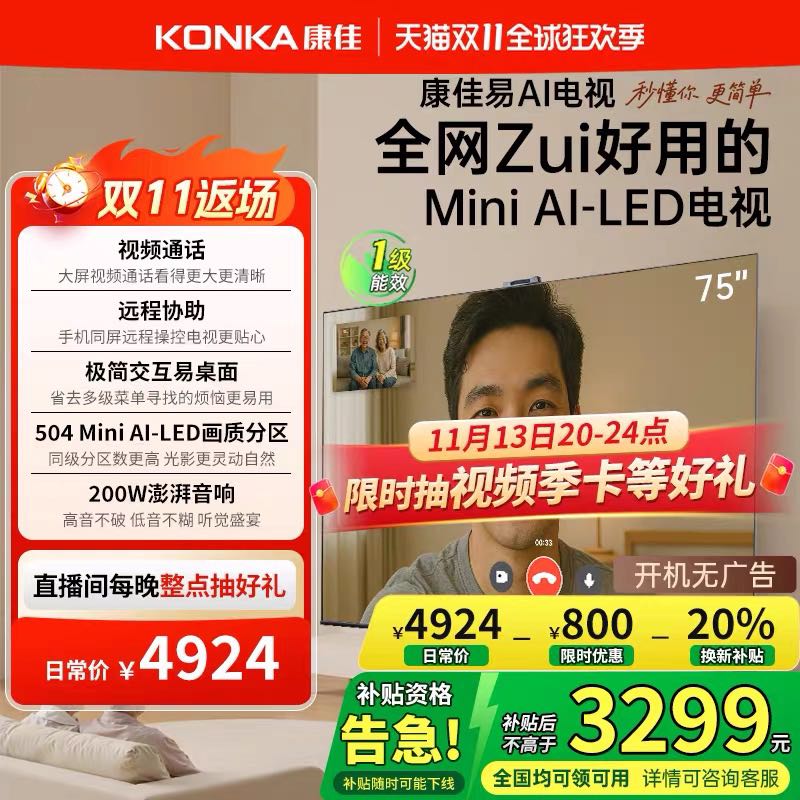 康佳电视75G10,拥有75英寸大屏,搭载惊鸿AI画质芯片,采用低反屏,运用MiniLED技术且有504分区,是一款智能平板液晶电视机。现在天猫康佳官方旗舰店此款电视活动售价5799元,下单可领取满500减5元会员券,还能参与立减1675元以及国家补贴20%减823.8元活动,下单1件,实...