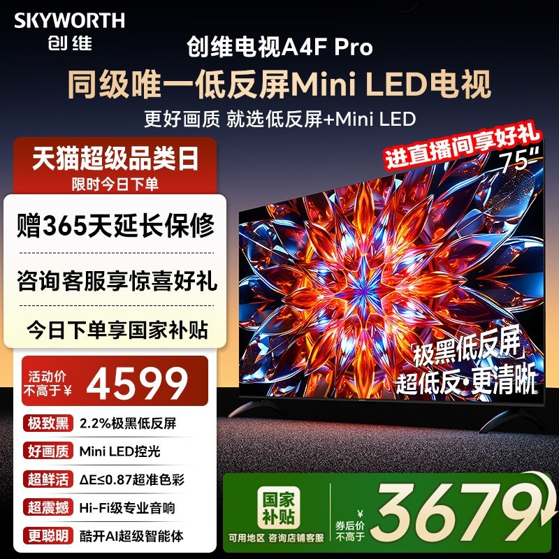 创维75A4F Pro 75英寸Mini LED低反屏电视震撼来袭,搭载4K超高清分辨率与Mini LED技术,画面细腻明亮,色彩层次丰富,配合低反光屏幕设计,强光环境下也能享受清晰视界,内置4GB+64GB大存储组合,运行流畅不卡顿,无论是观影、追剧还是畅玩大型游戏都得心应手,智能系统操作便捷,支持多种语音控制和多设备互联,打造智慧家庭娱乐中心。
