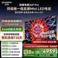 创维 85A4F Pro 液晶电视,拥有 85 英寸大屏幕,能带来震撼的视觉体验,并且支持 4K 分辨率,画面清晰细腻,色彩还原度高。目前创维自营售价 6199 元,PLUS 会员可享 9.96 折,还能领取 140 元优惠券,同时享受国补 20%,最终实付仅需 4827.36 元,喜欢的朋友可以入手。