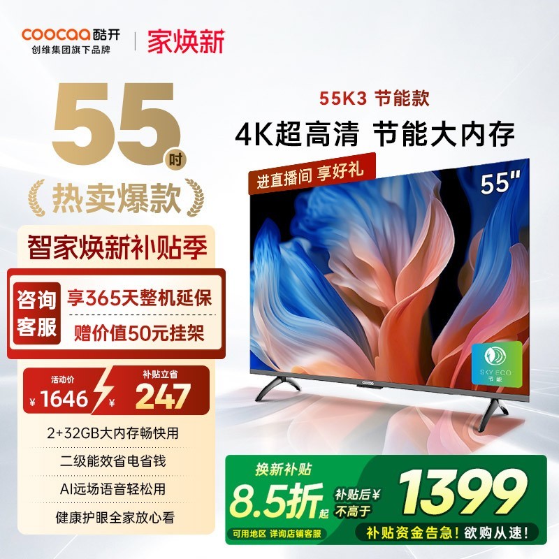 酷开创维电视K3节能款55英寸大屏震撼来袭,4K超清画质带来影院级视觉享受,支持AI远场语音,无需遥控器也能轻松操控,内置监控机顶盒功能,适配酒店、小区等多种场景使用需求,二级能效设计节能环保更省电。
