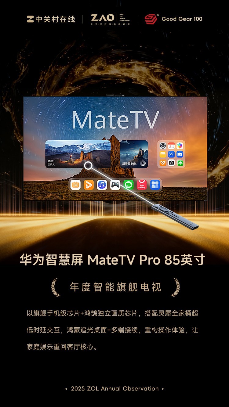 【ZOL中关村在线原创新闻】ZAO 2025中关村在线年度观察推选年度百大优秀产品奖项Good Gear 100(以下简称GG100),用以表彰年度科技行业标杆产品。2025年度GG100获奖名单正式公布,代表本年度优秀科技产品。 2025年度百大优秀科技产品:年度智能旗舰电视 华为智慧屏 MateTV Pro 85英寸