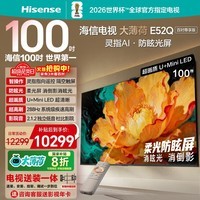 海信 Hisense E52Q 100 英寸电视,配备灵指 AI 指向遥控,操作更便捷,还有柔光防眩屏,能减少光线反射,观看体验更舒适。它采用超画质 U+MiniLED 技术,画面表现出色。