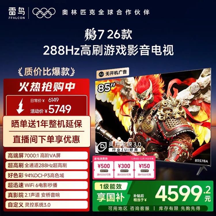 TCL雷鸟鹏7 26款85英寸电视震撼来袭,现活动售价9182元,多重优惠叠加后实付低至4299.5元,史无前例的超值价格等你抢!这款大屏电视拥有288Hz超高刷新率,画面流畅不拖影,无论是看大片还是打游戏都畅快淋漓,配备满血HDMI2.1接口,支持高帧率传输,完美适配次世代主机与高性能显卡,带来影院级视听享受。85英寸巨幕视野开阔,沉浸感十足,搭配TCL高品质显示技术,色彩还原真实细节丰富。目前参与满减、官方立减、限时补贴、消费券及国家补贴等多项优惠,到手价仅4299.5元,性价比爆棚,数量有限抢完即止,赶紧下单把影院级体验带回家!