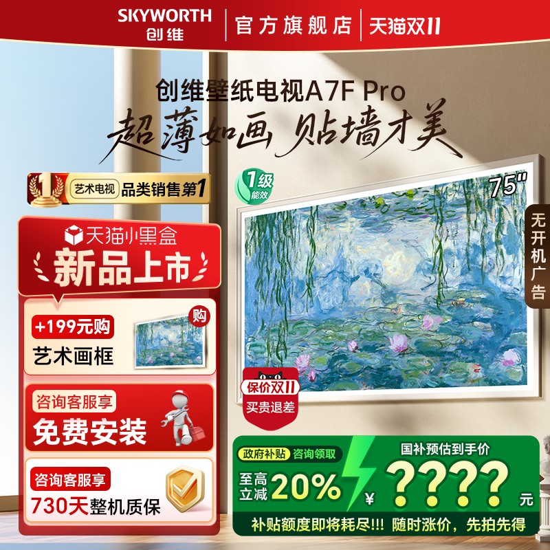 SKYWORTH 75A7F Pro新壁纸电视在天猫精选开启优惠活动啦!这款电视目前活动售价16999元,现在下单可领取满9249减1050元优惠券,还能参与立减2550元,88VIP可使用消费券,晒单还能返20元,另外还有补贴20%起减1639.8元的优惠。