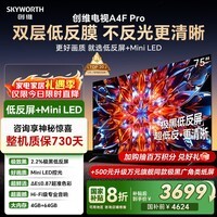 创维75A4F Pro 75英寸液晶电视震撼促销中,专为追求极致视听体验的你量身打造,4K超高清分辨率搭配AI智能芯片,画面清晰流畅,色彩还原真实,无论是观影、游戏还是家庭娱乐都能带来沉浸式享受;配备大功率音响系统,支持杜比音效,声临其境,让客厅秒变私人影院。