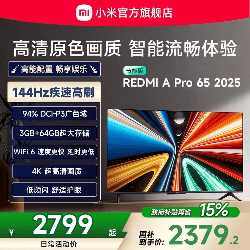 小米 REDMI 红米 A Pro 65 2025节能版 L65RB-APE 液晶电视 65英寸 4K 超高清大屏震撼来袭,搭载65英寸4K超高清分辨率屏幕,画质细腻逼真,色彩还原精准,带来影院级视觉享受。采用2025节能版技术,高效节能更环保,长时间使用也无负担。L65RB-APE黑色经典设计,简约大气,轻松融入各种家居风格。支持智能操控,流畅运行各类应用,满足观影、游戏、娱乐多重需求。