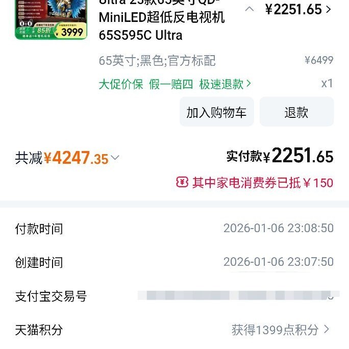 想拥有一台高品质液晶电视,雷鸟鹤6 Ultra系列 S595C Ultra液晶电视值得关注。它拥有出色的显示效果和先进的技术,能为用户带来震撼的视听体验。现在在天猫精选,这款电视目前活动售价为6499元,参与江苏国补后,到手价仅需2251元,相比原价6499元,有了大幅的价格优惠,...