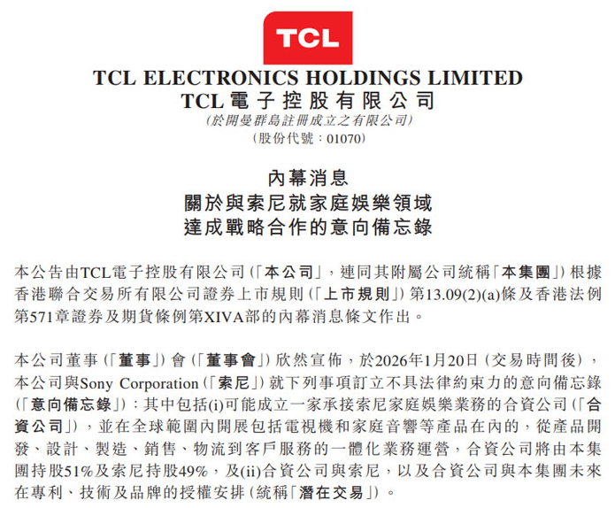 近日,消费电子行业传来重磅消息:TCL电子控股有限公司与索尼公司正式签署意向备忘录,宣布将在家庭娱乐领域展开深度战略合作,拟联合设立合资公司承接索尼相关业务,引发全球市场广泛关注。