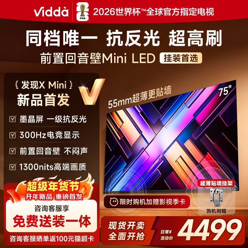 Vidda发现X Mini 75英寸海信电视机新品震撼上市,搭载75英寸大屏,采用75VX3S玄武锖配色,外观沉稳大气,质感出众;内置前置回音壁,声画同步更沉浸,音效澎湃有层次;作为全新升级的Mini LED旗舰机型,画质细腻、控光精准、对比度高,观影游戏体验全面跃升。
