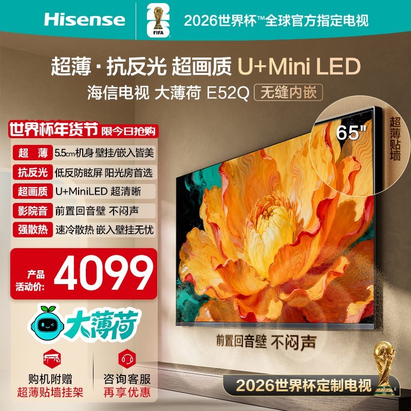 想换一台高品质电视的朋友别错过!海信电视大薄荷E52Q 65吋来袭。它能超薄贴墙,宛如一幅壁纸般贴合墙面,节省空间又美观。采用低反屏,有效减少环境光反射,观看体验更舒适。还搭载了MiniLED技术,画面显示效果出色。