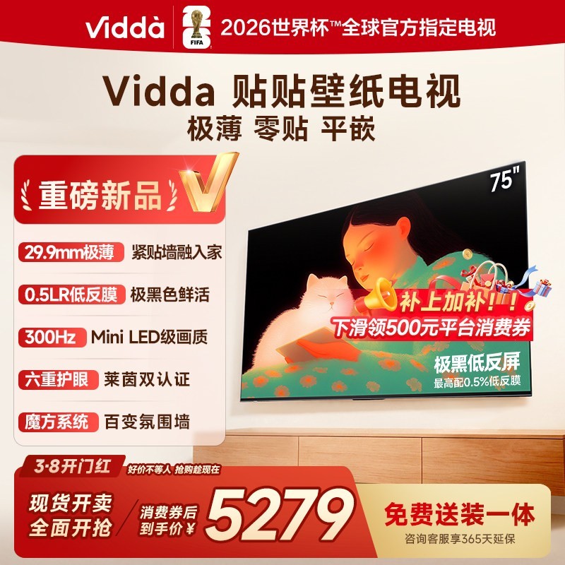 Vidda贴贴壁纸电视,拥有75英寸大屏,具备MiniLED级画质,能呈现出细腻、清晰且色彩鲜艳的画面。它设计超薄,可实现贴墙安装,节省空间又美观。