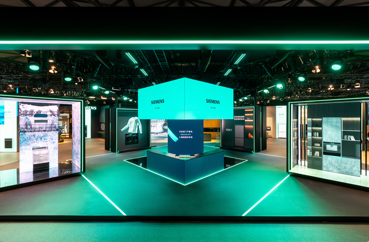 走进西门子家电展区,首先映入眼帘的是中央品牌展示区,冰箱、厨房电器、洗碗机、洗烘四大品类特展区环绕四周。展台采用1100平方米开放式布局,44米超长面宽打破了传统展台的边界感。